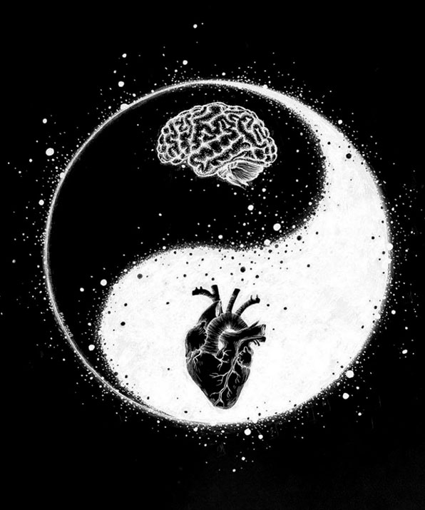 Tags: Arte em avaliação, RedVote, 0308AGO25, Yin-Yang, Cérebro, Coração, Dualidade, Contraste, Anatomia, Psicologia, Preto-e-Branco