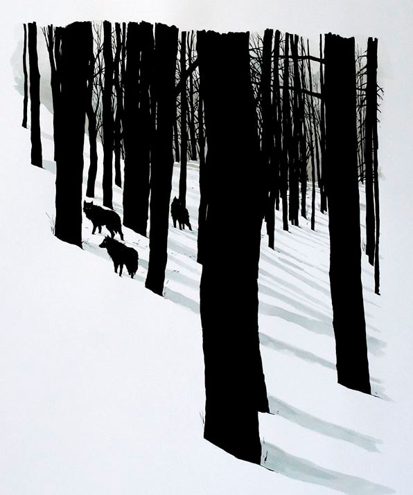 Tags: Arte em avaliação, RedVote, 0308AGO25, Lobo, Floresta, Neve, Monocromático, Inverno, Silhueta, Sombra, Natureza