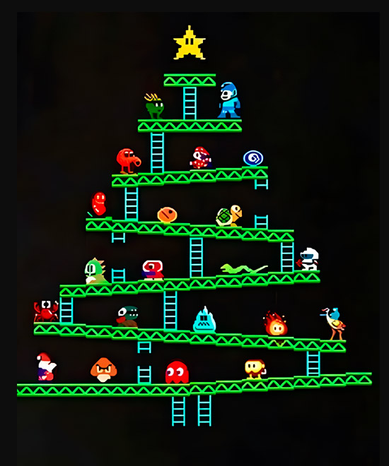 Tags: Arte em avaliação, RedVote, 0308AGO25, Natal, natalino, árvore de Natal, game, gamer old school, jogo de plataforma, Mario Bros, DK, Donkey Kong, Pac-man, Mega Man, pixel, Atari