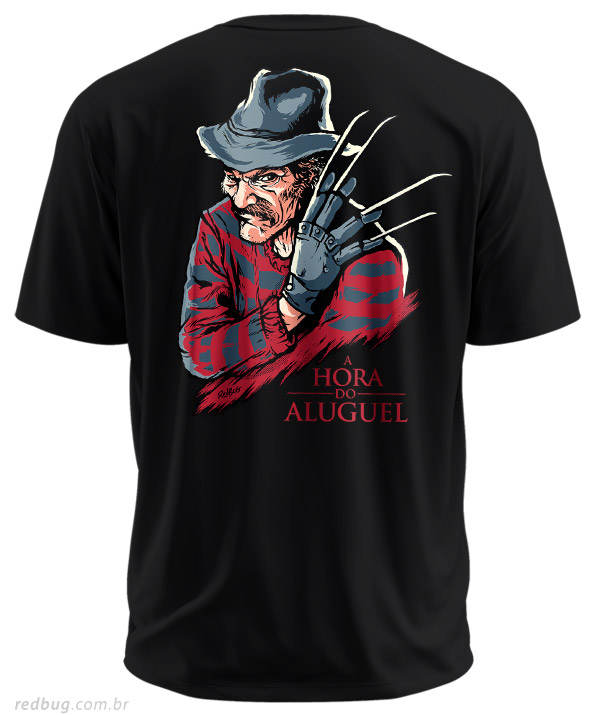 Para quem gosta de estampa nas costas, a RedBug traz a paródia 'A Hora do Aluguel', onde o icônico Seu Madruga encontra o terror de 'A Hora do Pesadelo'. Nesta modelagem masculina, a arte genial fica nas costas, enquanto na frente, o besouro vermelho, nosso símbolo, garante o estilo no lado esquerdo do peito. É o mashup perfeito de humor geek e cultura pop, garantindo que você não passe despercebido. Se prepare para o terror da dívida!