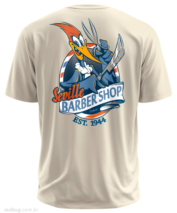 O Pica-Pau apronta em todos os lados! Nesta versão, a estampa vibrante do Barbeiro de Seville fica nas costas, surpreendendo quem vem atrás. A frente traz o escudo RedBug, mantendo o estilo geek com discrição. Camiseta masculina 100% algodão para fãs de clássicos.