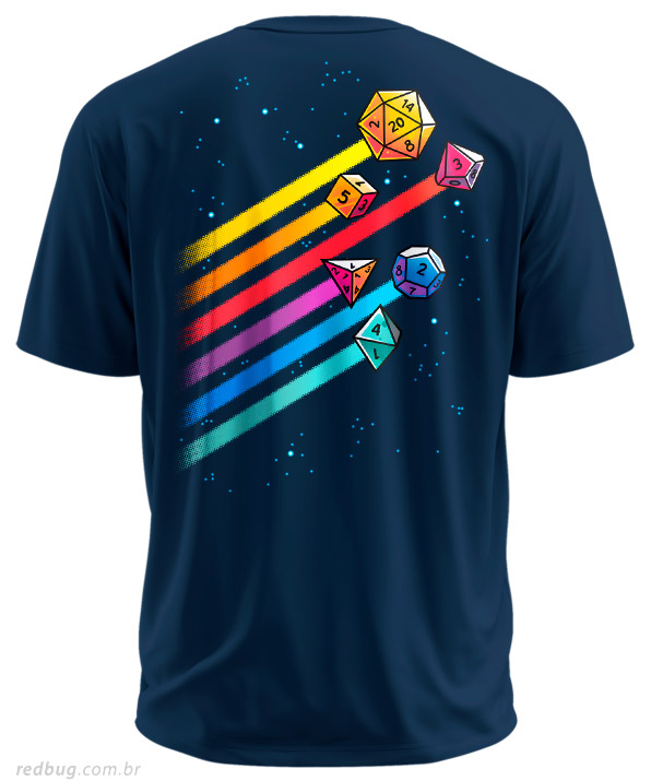 Mergulhe no Hiperespaço RPG! Esta camiseta masculina com estampa nas costas é um portal para a sua próxima aventura. Dados d20 coloridos flutuam em um universo estrelado, perfeito para mestres e jogadores. O escudo RedBug na frente garante o estilo geek-nerd. Qualidade e criatividade em um só lance.