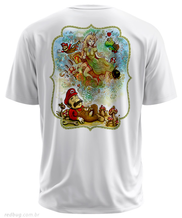 Uma homenagem ao descanso do herói dos games com um toque diferenciado. A camiseta Mario's Dreams traz a ilustração principal nas costas, revelando os sonhos do encanador, enquanto a frente exibe o escudo do besouro RedBug no peito. Modelagem masculina confortável e cheia de personalidade.