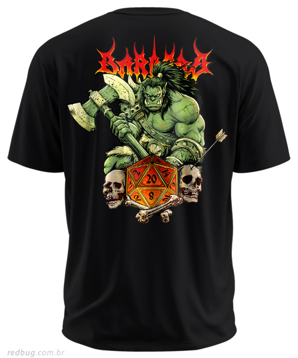 Vire-se para a aventura! A estampa nas costas da sua camiseta RPG Classe Bárbaro mostra o seu lado guerreiro. Qualidade e criatividade RedBug em 100% algodão penteado. Perfeita para impressionar de frente e de costas no seu próximo jogo de RPG. Uma arte geek e nerd que te acompanha!