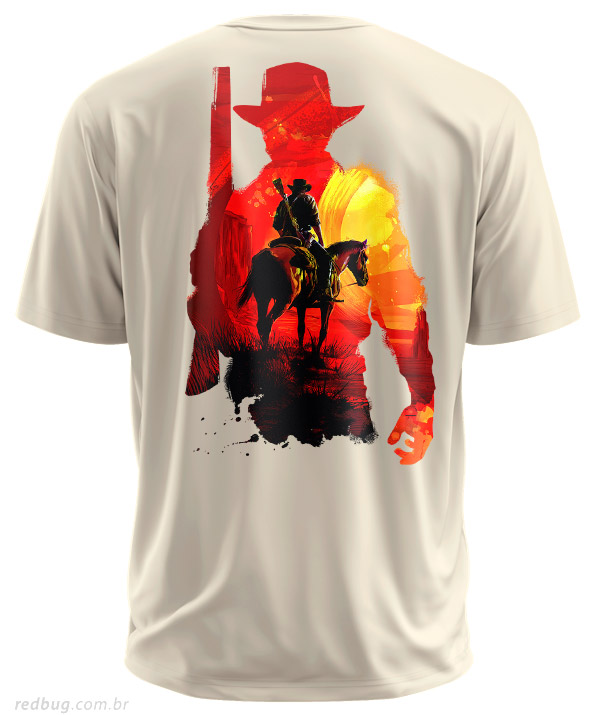 A camiseta Sangue e Redenção traz a estampa nas costas e o besouro RedBug no peito. Ideal para fãs de Arthur Morgan e John Marston que curtem um visual discreto na frente e impactante atrás. Tags: Red Dead Redemption, cowboy, faroeste, game, jogo, Arthur Morgan, John Marston.