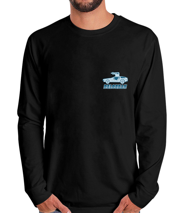 Camiseta manga longa pocket Delorean Auto da RedBug em algodão penteado, inspirada em De Volta para o Futuro. Ideal para quem ama referências geek com arte minimalista e discreta.