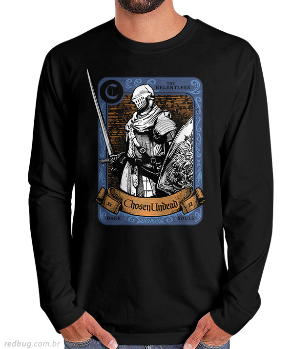 Proteja-se do frio com a Camiseta Manga Longa Chosen Undead. O equilíbrio ideal entre conforto e proteção, em algodão de alta qualidade, mantendo o visual Dark Souls nos dias de clima mais sombrio.