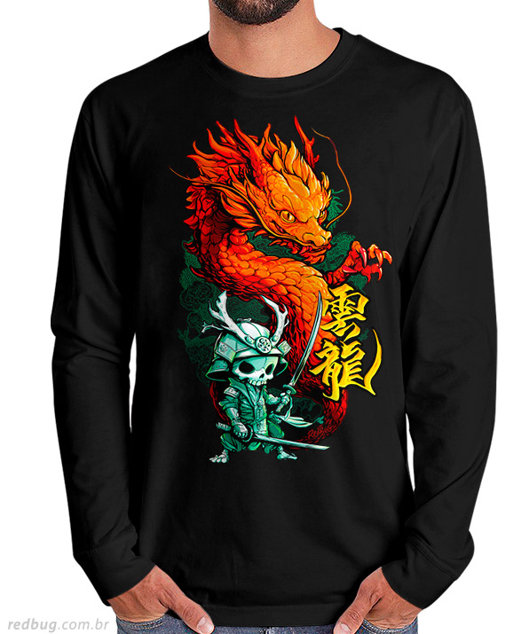 O Espírito de Dragão agora em manga longa! Vista a força da estampa geek com dragões e samurais, e desfrute do conforto do 100% algodão penteado de excelente qualidade da RedBug. Qualidade e estilo para os dias mais frios do geek e do nerd.