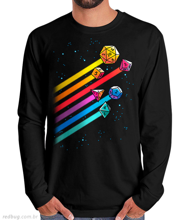 Mantenha o estilo e o conforto! Nossa manga longa Hiperespaço RPG em algodão penteado traz a magia do universo geek para você. Dados de mesa coloridos contra um céu estrelado: a arte ideal para quem vive o RPG e não abre mão de uma peça de qualidade da RedBug.