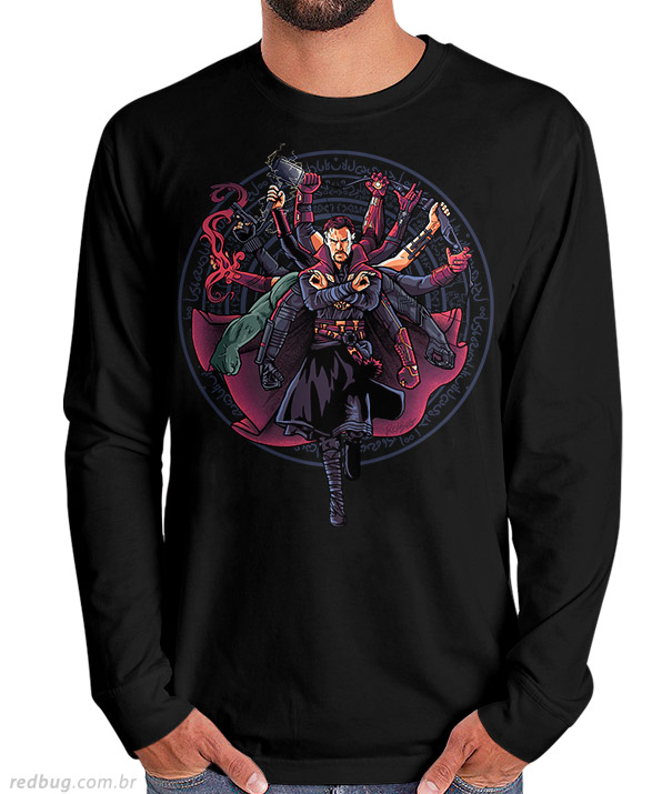 Encare o frio com a proteção de todos os heróis. A camiseta manga longa Vai Uma Mãozinha é feita em 100% algodão penteado, garantindo conforto térmico e muito estilo. A estampa do Doutor Estranho "armado até os dentes" é o destaque para qualquer fã da Marvel.