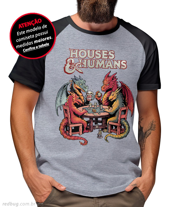 A Camiseta Raglan Houses and Humans traz um visual despojado com mangas contrastantes. Vista essa paródia nerd de RPG com máximo conforto e a qualidade imbatível da malha 100% algodão penteado!